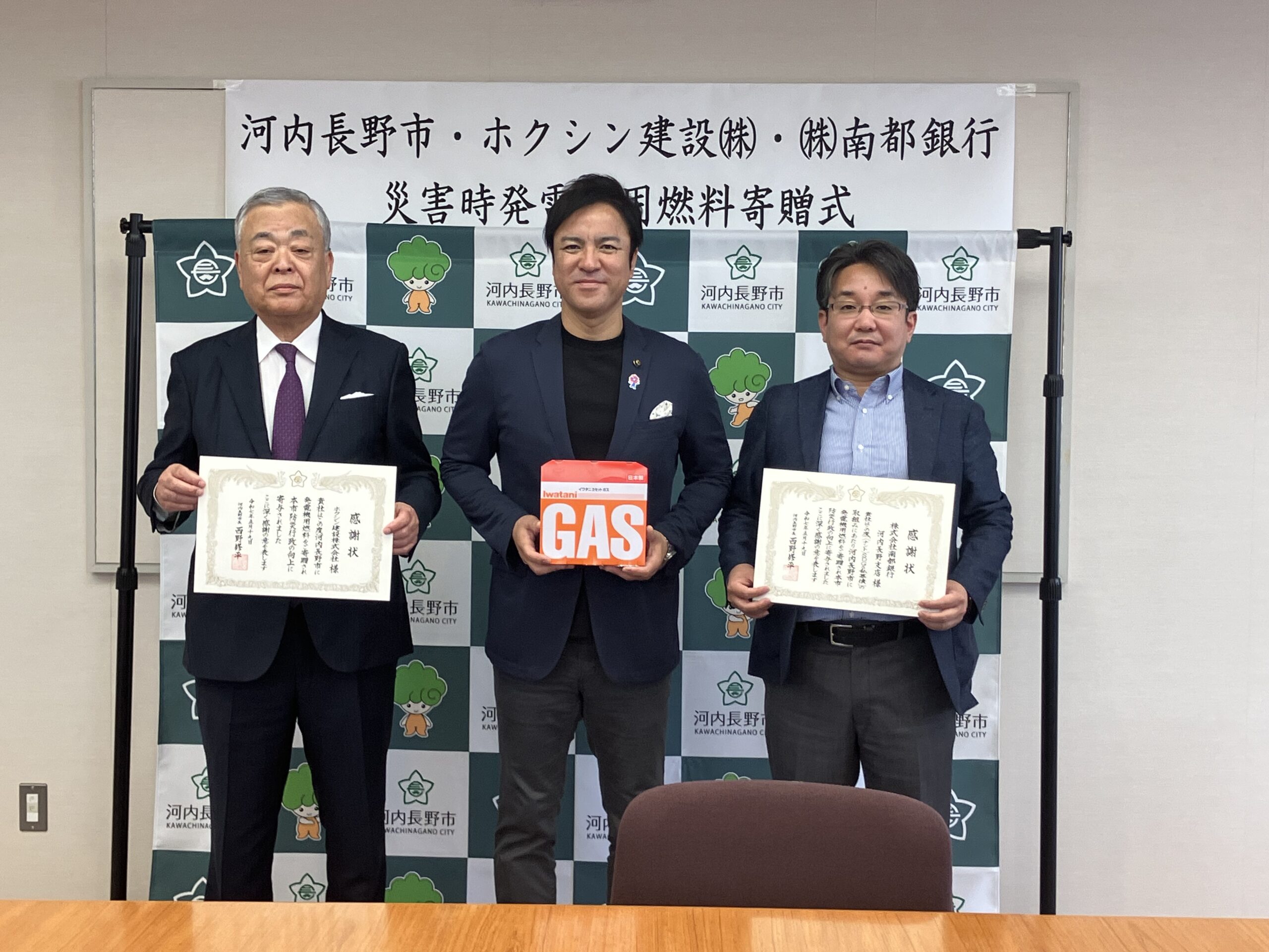 本年5月19日には、株式会社 南都銀行様と共同で、災害発生時の電力確保を支援するため、 発電機用カセットボンベを河内長野市へ寄贈いたしました。