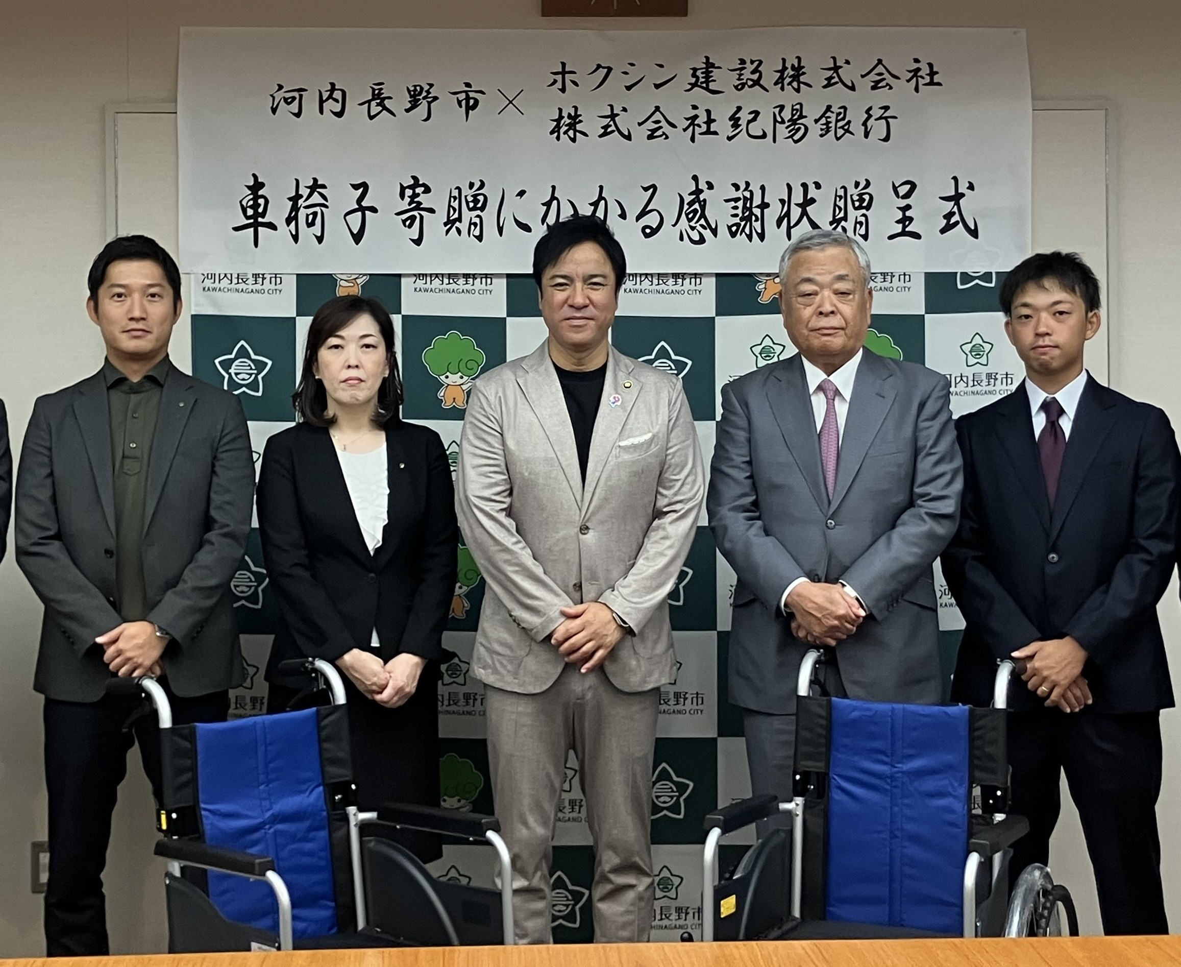 また、10月9日には、紀陽銀行様と共同で、 高齢者や障がいを持つ方の移動を支援する車椅子7台を寄贈いたし ました。 寄贈品は、市社会福祉協議会や公共施設に設置され、 市民の皆様の生活支援と地域福祉の推進に活用されます。